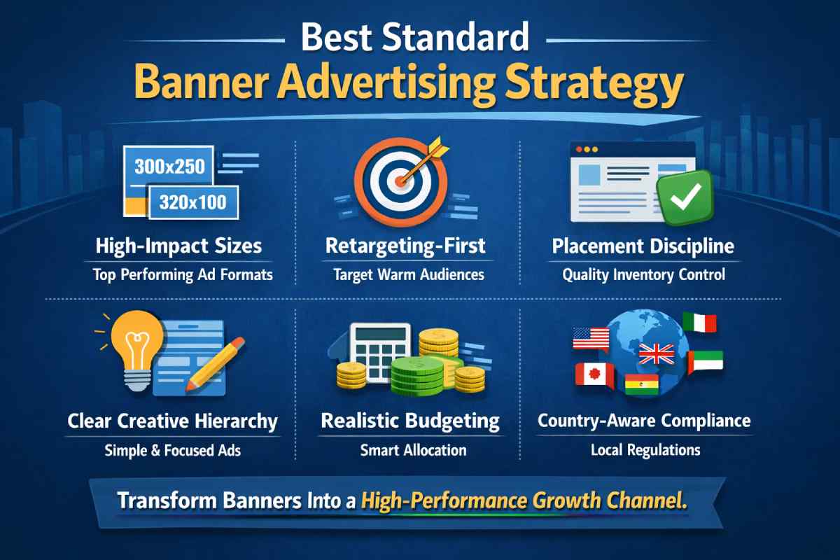 High-impact banner sizes, retargeting-first campaigns, disciplined placement control, a clear creative hierarchy, realistic budgeting, and country-aware compliance are the pillars of effective standard banner advertising. Banner ads remain globally scalable across markets like the US, UK, Canada, Australia, India, Germany, and the UAE—but they reward discipline, not guesswork. When you treat banner advertising as a structured performance system—guided by data, creative clarity, and smart inventory selection—it becomes one of the most controllable and reliable mid-funnel growth channels in modern digital marketing.